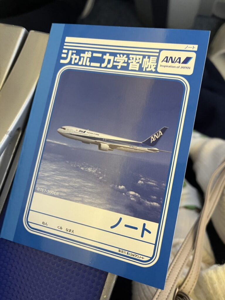 1歳5ヶ月にして、今回が人生20回目のフライトとなるベテランの娘(笑)。 プレミアムクラスだからといって景品が豪華になるわけではありませんが、今回は初めて「ジャポニカ学習帳(ANAオリジナル)」をいただきました!