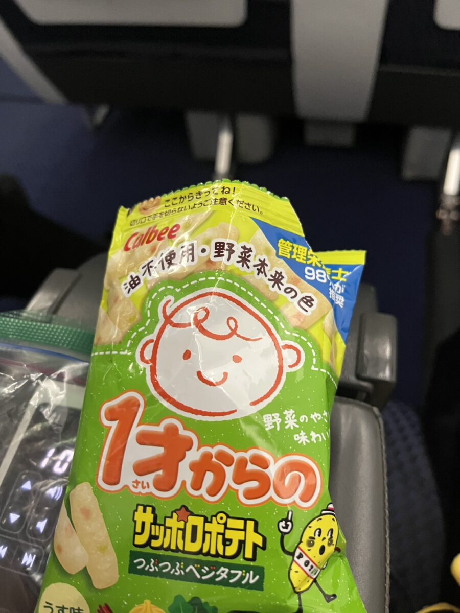 • ポイント: これらのおやつは数が多いだけでなく、口の中で溶かして食べるので、1袋で30分くらい持たせることができます。ちょうど離陸からシートベルトサインが消えるまでカバーできるんです。