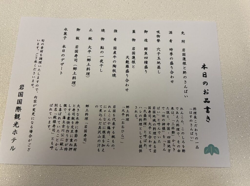 正直な感想 「温泉」と「食事」をメインに楽しむおこもり旅なら、リピートはなし。 お値段も約46000円と安いとは言えない金額でした。ただし、錦帯橋という場所に用があって泊まりたいなら、立地も良く非常におすすめです。